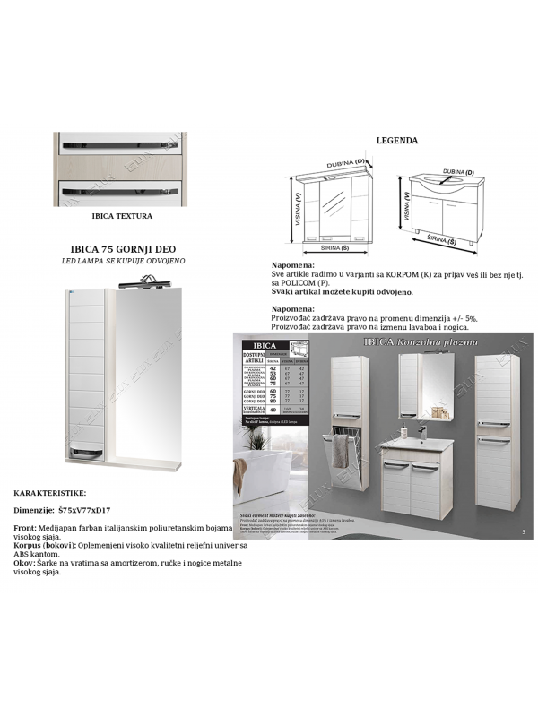 Kupatilski ormarić gornji Lux Ibica 75 je zidni ormarić, dimenzija 75x77x17cm. Ormarić čini veće ogledalo i ormarić sa tri police, za uredno odlaganje kozmetike, sredstava za higijenu ili pribora. Kupatilski ormarić gornji Lux Ibica 75 je napravljen od kombinacije medijapana i oplemenjenog kvalitetnog reljefnog univera sa ABS kantom. Kupatilski Vrata ormarića su izrađena u beloj boji, sa poprečnim linijama, dok je ostatak ormarića izrađen u svetloj boji drveta. Ormarić gornji Lux Ibica 75 je dostupan u dve varijante, sa ormarićem sa leve ili sa desne strane.