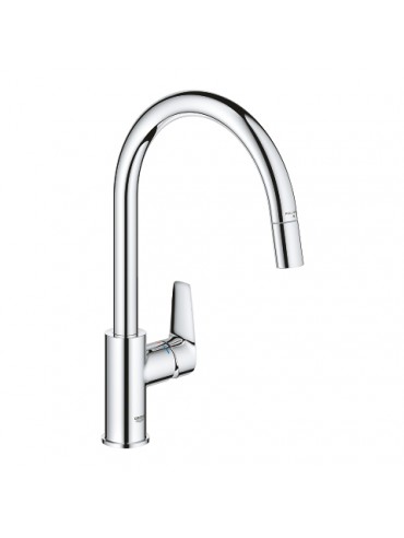 Moderna, jednoručna baterija za sudoperu sa izvlačnim tušem, prepoznatljiva po visokom rotirajućem izlivu i hrom finišu.