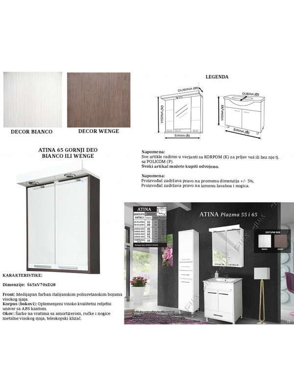 Kupatilski ormarić Lux Atina 65 gornji je viseći element za kupatila jednostavnog, ali atraktivnog dizajna. Prednji deo kupatilskog ormarića Lux Atina 65 gornji je prekriven sa parom ogledala, iznad kojih je postavljen ram sa led lampama. Kupatilski ormarić Lux Atina 65 gornji je kvalitetne izrade, od medijapana i univera presvučenog italijanskim poliuretanskim bojama visokog sjaja. Dimenzije kupatilskog ormarića Lux Atina 65 gornji iznose 65x70x28cm. Orman je dostupan u braon i beloj boji.