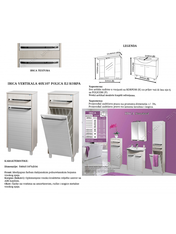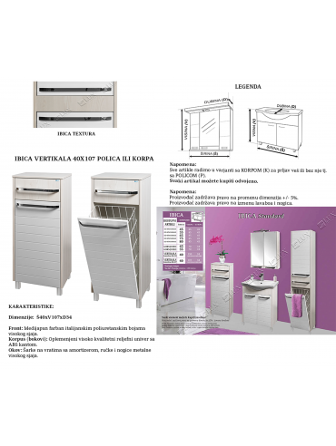 Kupatilski ormarić vertikala Lux Ibica 40x107cm korpa je praktično rešenje za održavanje reda u kupatilu. Donji deo ormana čini komotna korpa za veš, izrađena od žice. Iznad nje je postavljena fioka za sitnice. Kupatilski ormarić vertikala Lux Ibica 40x107cm korpa je napravljen u svetloj boji drveta, sa belim vratima sa poprečnim šarama. Kupatilski ormarić vertikala Lux Ibica 40x107cm korpa je izrađen od medijapana i oplemenjenog reljefnog univera. Ručke i nogari su od metala, a šarke su napravljene sa amortizerima.