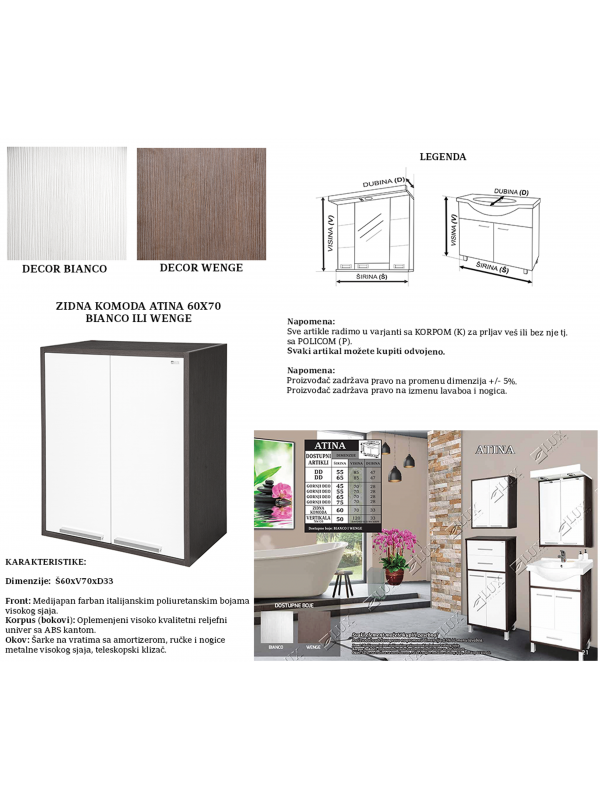 Kupatilski ormarić zidna komoda Lux Atina 60x70cm je zidni ormarić jednostavnog, klasičnog dizajna, dimenzija 60x70x33cm. Front kupatilskog ormarića zidna komoda Lux Atina 60x70cm je napravljen od medijapana, presvučenog poliuretanskom bojom visokog sjaja, dok je korpus napravljen od visoko kvalitetnog reljefnog univera sa ABS kantom. Ručke ormarića su izrađene od metala visokog sjaja, a šarke imaju amortizere. Unutrašnjost ormana čine dva odeljka podeljena policom. Kupatilski ormarić zidna komoda Lux Atina 60x70cm je dostupan u braon boji sa belim vratima i u kompletno beloj boji.